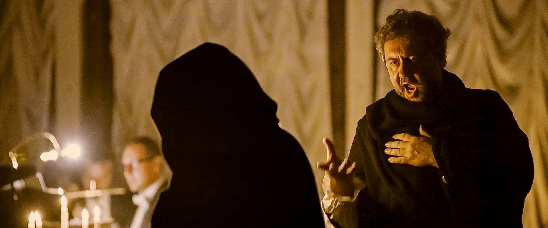 Rigoletto travels and unfolds throughout the halls of the Palace where the choice to use candlelight creates a Caravaggio-style backlighting which enhances the dramatic power of the Opera.